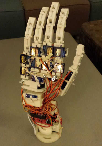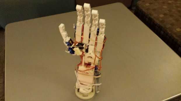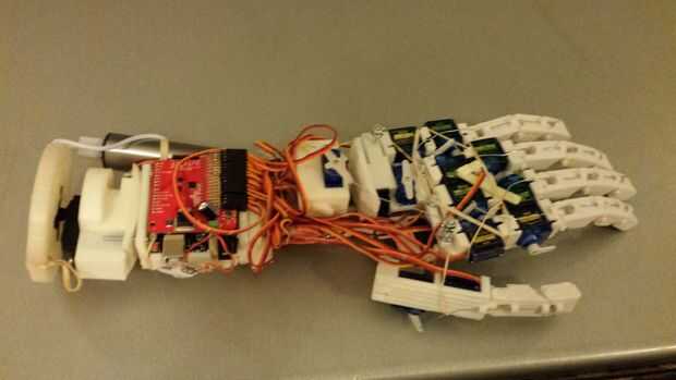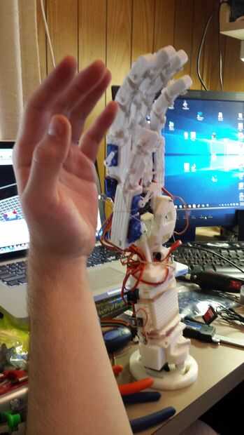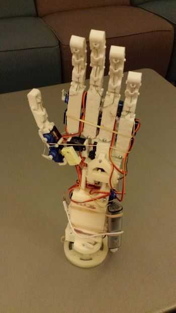 Hola a todos! Este es mi prótesis de mano y el brazo de prototipo he estado diseñando desde hace varios meses. Es todavía un poco de un trabajo en progreso, y ya que estoy terminando con clases en la Universidad para el semestre aún no he tenido tiempo para desarrollar su funcionalidad completa. Aparte de ser esencialmente completamente imprimibles 3D (con la excepción de los cables electrónicos y de actuación), está diseñado para ser capaz de todos los movimientos de una mano humana sana y brazo por el codo (que actualmente estoy diseñando). También es compatible con las capacidades de movimiento adicionales que no tienen manos más robóticas: se puede doblar y enderezar los dedos independientemente, pero puede (pudiendo) también los señalan en diferentes ángulos y rectas - todavía estoy recibiendo el código para esto. It (se puede poder) también separado los dedos, un movimiento que sólo he visto por 1 otro robot humanoide (aunque todavía no he conseguido que haga un correcto Vulcano saludo). En el largo plazo planeo en la construcción de un guante de control de movimiento y continuar construcción hasta al menos el hombro y posiblemente hacer un sistema de control utilizando un Kinect o un movimiento de salto. Por ahora, sin embargo, se pueden realizar más movimientos de la mano introduciendo manualmente los comandos a ejecutar movimientos preestablecidos o para controlar individualmente cada servo.