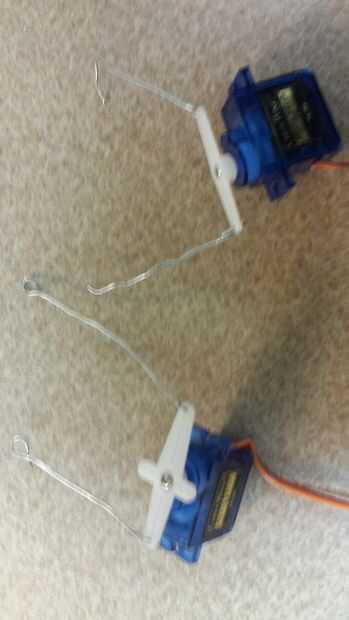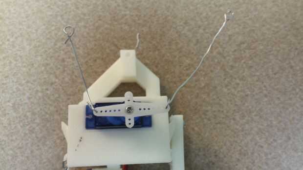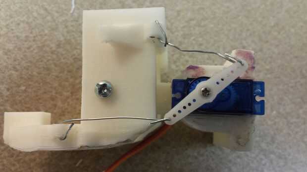 Los servos deben caer justo en su lugar las piezas de la muñeca, aunque, otra vez, tuve problemas con las tolerancias que colocándolos en lugar difícil. Como se mencionó anteriormente, la colocación de los brazos de servo es mucho más fácil después de ejecutar el bosquejo de la calibración, pero el ángulo por defecto en el arriba y abajo tilt servo (en algún lugar alrededor de 90 grados) debe ser similar a la de la foto 4 º - esto permite que la muñeca se incline hacia abajo más lejos de lo que puede inclinar hacia arriba, como una mano humana real (cómodamente, de todos modos). Tenga cuidado de no ángulo demasiado hacia atrás, o puede vendar al inclinar hacia arriba. Por último, es probablemente más fácil de cortar los cables en los brazos de servo después de instalar la muñeca en la mano - lo importante es que debe ser capaces de moverse con fiabilidad la mano.