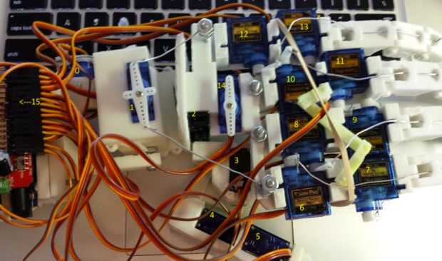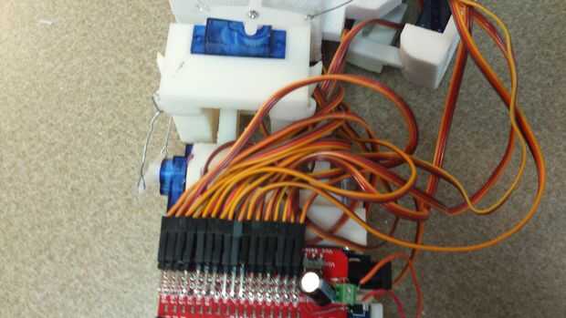 Este paso es fundamental para corregir la operación del brazo y le evitará tener que reescribir código innecesariamente. Deben conectar los servos al escudo en el orden mostrado en la primera foto (#15 es para el servo del antebrazo gire en la siguiente parte del Instructable). No debería ser ningún problema de longitud del cable, pero para estar seguro se puede colocar la mano de tal manera que todos los servos será lo más lejos del regulador como sea posible antes de enchufarlos. Si vas para la gestión de cable buena que también puede tratar de llevar todos los cables entre el pulgar y la muñeca como se muestra en el cuadro 2.
