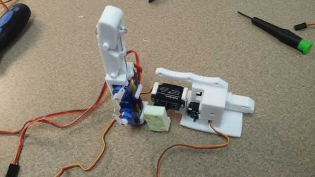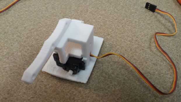 El pulgar está montado sobre todo al igual que los otros dedos con algunas partes adicionales para los ejes de rotación adicional. Siga el paso anterior para montar la parte del dedo, y luego inserte la parte 2 de la palanca de pulgar en la ranura en el carpo. Tuve algunos problemas con tolerancias en mis impresiones, por lo que no cabe absolutamente en la medida en que debe o salir muy fácilmente. Inserte un brazo de servo único en la ranura en la parte inferior de la palanca y asegúrese de que el canal en la parte superior se alinea con el agujero en el centro del cilindro de conexión servo.