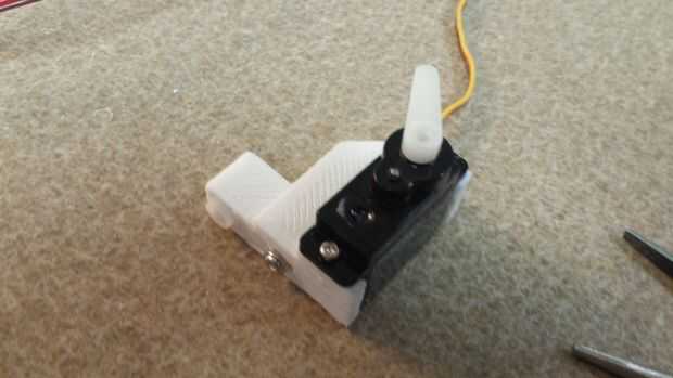 Para el montaje de la palanca intermedia, colocar un servo a la parte del pulgar palanca 1 como se muestra en la imagen y atornille por lo menos 1 de los lados. Inserte un brazo de servo único en la ranura en el lado y luego fíjelo con un tornillo o pegamento en su lugar. Hay un canal por el otro lado del del brazo de servo para permitir el acceso para el tornillo que sujeta al servo, así que asegúrese de las líneas de canal para arriba con el agujero en el centro del brazo de servo.