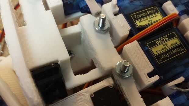 Si vas a compilar la muñeca así, asegúrese de que poner el perno de conexión a través del orificio en la parte inferior de la ensambladura del carpo antes de colocar el servo de propagación en el lugar. Nota: archivo del CAD puede o no contener este agujero, así que puede que tenga que perforar hacia fuera manualmente - colocación no es un problema como la cabeza puede sentarse bajo bastante adentro del local del servo. Es incluso más fácil si esperas para este servo en su sitio hasta que esté afinando con la muñeca.