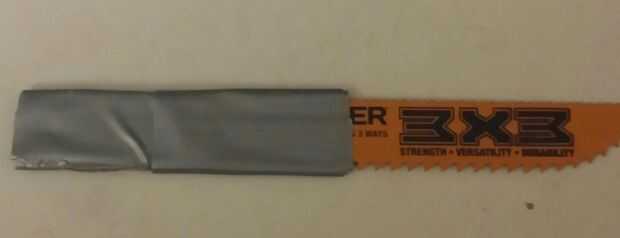 Sierra de mano hecha de un intercambio hoja de sierra y madera de pino de 1 x 2.Partes:1. Sierra de intercambio2. pieza de madera de pino de 1 x 2, tal vez 6 a 8 pulgadas de largo3. 1,25 madera tornillo; Prefiero torx (T-25 en este caso)4. plástico b