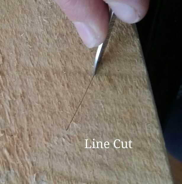 El corte de línea utiliza el punto del cuchillo y hacerlo manteniendo más o menos el cuchillo como un lápiz y trazar una línea de diferentes profundidades dependiendo de la presión de uso. Utilizar este corte comienzan la mayoría de los proyectos y puede ser utilizado con otros cortes para una serie de efectos.