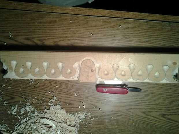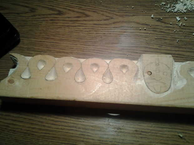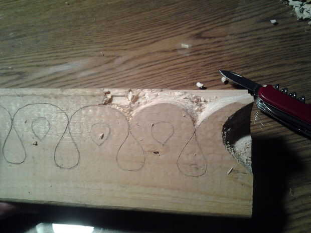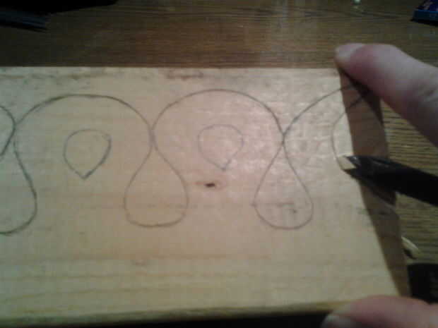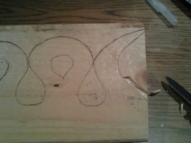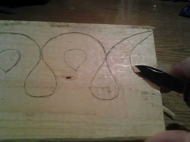 Luego dibujé el diseño que quería; Usted puede utilizar bolígrafo o lápiz, o no importa puesto que va a ser tallado de todos modos. Cortar la ranura de la espada con los cortes de línea más profundos que pude manejar y algunos bastante escarpados cortes de borde en ángulo. Luego, usando el corte de la línea, fue sobre todo el diseño y comenzó cortando a la profundidad deseada con el borde de corte en el exterior y el corte del agujero y el borde de corte entre los lazos. una vez que fue a la profundidad que se quería, alisó hacia fuera usando el corte redondo, excepto la cara que se me queda con los bordes de la talladora.