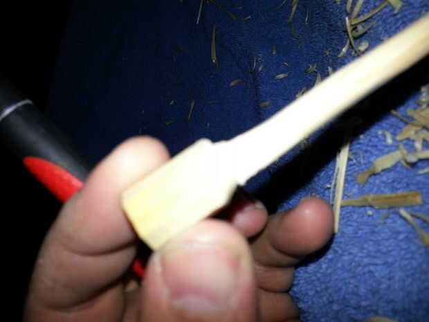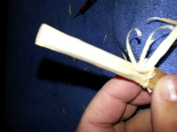 De la ranura que usted acaba de poner en la madera hasta el final, en el lado largo de la madera de la ranura, cuidadosamente afeitado apagado la madera hasta que se forme un vástago redondo. Tenga cuidado de no hacer demasiado desproporcionado (lo perfecto es muy difícil). Constantemente gire la pieza para que usted siempre está tomando la madera de un lado diferente. Utilizo el método de "Cortar las esquinas". En cualquier lugar puedes ver sensación de una arista o esquina, aplanarla con el cuchillo, tomando cortes ligeros y ligeros cada paso, hasta que relativamente redonda. No obsesionarse sobre lo que es perfecto, por eso contamos con papel de lija. Trate de mantenerlo centrado. Usted quiere tomar hasta aproximadamente 1/3 de pulgada de grosor, más o menos.