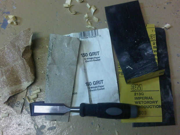 Libremente seguí los consejos de este blog sobre cuchara de talla (http://www.spoonlady.com/hothow.htm).  En retrospectiva, probablemente debería haber usé una madera más dura que el pino.  Sus consejos lijadora funcionaron bien.  Usando el papel de la arena que tenía en mano, fue de un grano grueso 80, 150 a un 800 (industria automotriz) que uso para afilar.  Era un salto desde los 150 a los 800 pero era lo que tenía disponible.  He seguido consejos de spoonlady y limpiar la espátula con un paño entre granos.