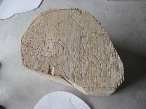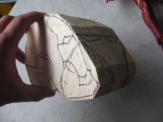 Con la punta de un lápiz mecánico, trazado y había impresionado los detalles de la máscara en la balsa a ambos lados del bloque de madera. Entonces dibujé en los detalles con sharpie trabajar como guía las marcas en los lados y la parte delantera de la máscara.