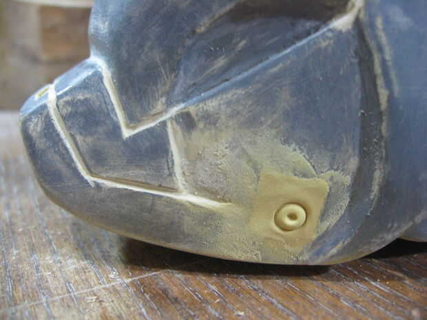 Detalles más difíciles fueron agregados por creando pequeñas áreas de madera, rellenando el vacío totalmente con masilla para madera y luego formar el relleno mientras estaba todavía suave (segunda foto).