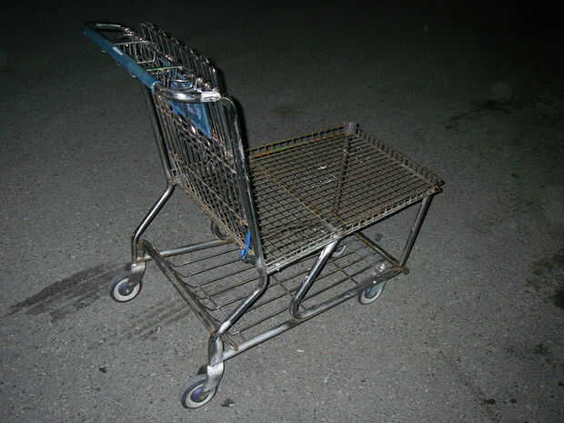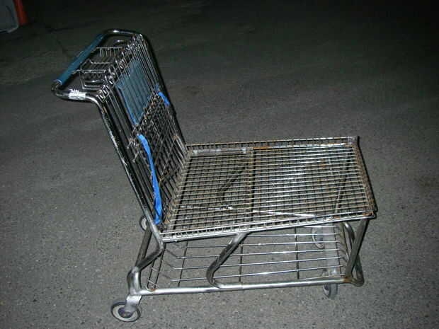 Este carro fino apareció en nuestras instalaciones recientemente. Alguien corta los lados de la canasta, dejando sólo un labio para detener cosas resbalen. Soldó con autógena en dos postes verticales en la parte delantera para evitar flacidez. Es muy útil, por que quiero decir realmente se acostumbra mucho.