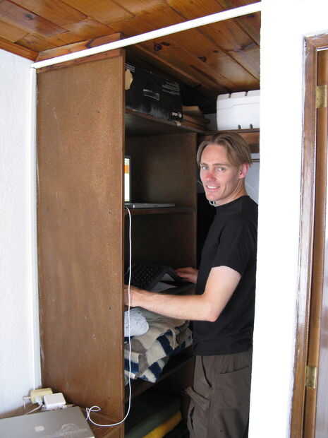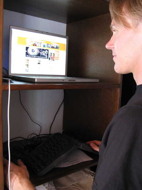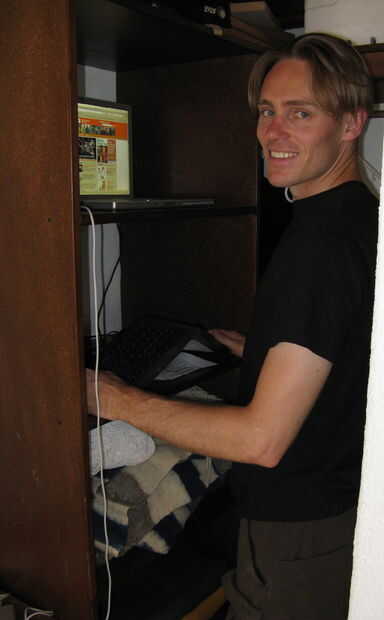 Trajo su teclado de dividido Goldtouch y a la izquierda y diestro ratones vertical, como se mencionó en el anterior tema de Instructables y foro. Aquí, él ha encontrado un conjunto de estantes que están aproximadamente a la altura correcta y poner el teclado y ratones debajo de la laptop, que es a nivel de la cabeza. Es un poco demasiado alto y los estantes no regulables, pero es un mundo de diferencia sobre el RSI y la espalda y el cuello dolor asociado con el trabajo en un ordenador portátil mientras que realmente en su regazo o sobre una mesa.