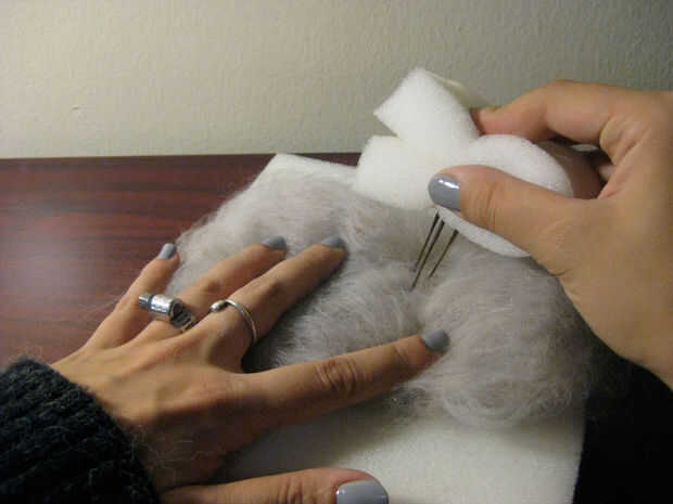 Las pequeñas barbas Haz empujadas a través de las fibras, engancharlos y levante que perfora a través. Esto enreda las fibras, se puede perforar cualquier que manera más concentrarse en un área, más enreda hasta y es compacto en esa una zona. Esto te permite obtener escultórica, pero para este tutorial, queremos hacer una pieza plana, así que queremos perforar nuestras agujas uniformemente alrededor de las fibras.