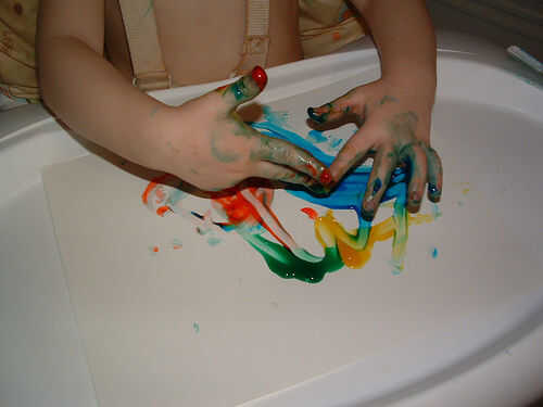 Si tienes un bebé, es muy fácil obtener huellas. Vierta una mezcla de diferentes pinturas de colores en un recipiente de plástico reciclado y remolino los colores de todo un poco. Sostenga al bebé delante de usted y presione su pies/pie en la pintura como si él o ella estuviera en ella. Pulse sus piececitos en el papel de la misma manera. Pulse rápidamente y tire el papel, antes de que la oportunidad de mover los dedos de los pies! Si usted quiere conseguir pequeñas huellas, es mejor hacerlo cuando está durmiendo tu bebé wee, o durante una sesión de enfermería si usted tiene un socio para trabajar con usted. Tenderle la mano y abrir los dedos suavemente. Pulse en la pintura y luego otra vez en el papel.
