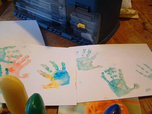 Permita que el niño juega en las pinturas de dedo y relajado. Mi hija es justo debajo de dos, así que empecé a hacer las huellas 3/4 del camino a través de su primer cuadro y luego a lo largo de su segundo cuadro. Así, tuvo tiempo suficiente para explorar la pintura y sentir su textura antes de que quería su pequeña impresión de la mano. I intercambiar hacia fuera de la cartulina muy rápidamente y se llevó una mano a la vez y presiona en el papel. Luego cambié su imagen hacia ella rápidamente. Obtener las impresiones rápidamente sin su ni siquiera darse cuenta realmente lo que estoy haciendo, y ella consigue su papel con manchas de pintura en él para que podamos conseguir una "recarga" en sus manos antes de la próxima ronda de impresión de mano. Tengo tres páginas de impresiones antes de que ella fue hecha pintura y había un montón de mi guirnalda con un par sobrantes para tarjetas hechas a mano.