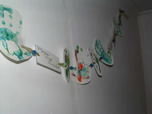 Ate arcos en el extremo de la cinta y colgar tu guirnalda con tachuelas en la pared para que todos puedan disfrutar! Variaciones: Tienen todos los miembros de sus familia hacer impresiones y hacer una familia guirnalda para colgar en la casa o enviar a los abuelos. Hacer una guirnalda "Llegar bien" o un "We Miss You" o "Welcome Home" guirnaldas!