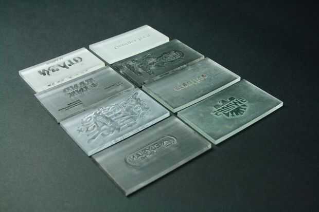 Hay algunas opciones para la creación de placas de impresión. Desde que tuve acceso a un cortador láser, fui a ciudad de grabado de placas de acrílico de 1/4". Los resultados fueron bien, pero las placas deformado y causaron algunos problemas durante la impresión. Todo estaba satisfecho con las placas grabadas de láser, que no producen resultados profesionales por cualquier medio, pero era una forma barata de experimentar con diseños de tipografía diferentes.