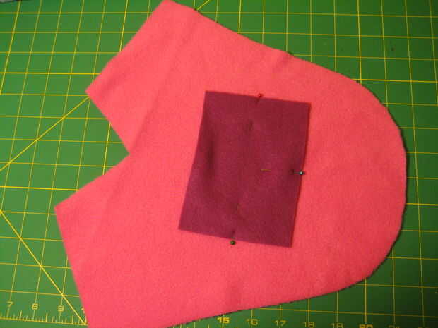 Si el paño grueso y suave es como el mío, realmente es un derecho y un revés (si aún tienes el orillo en su tela, las palabras están impresas en el lado derecho). La derecha es siempre tan levemente peletero, para voltear ambas piezas con el lado derecho hacia arriba. Coloque la pieza de bolsillo en una de las piezas de guante del paño grueso y suave. Usted querrá algo centrado para que cuando el calentador está en el bolsillo llegará alrededor de donde se reunirán las dos manos. El bolsillo en lugar de PIN y coser la parte inferior, izquierda y derecho contra derecho, dejando abierta la parte superior.