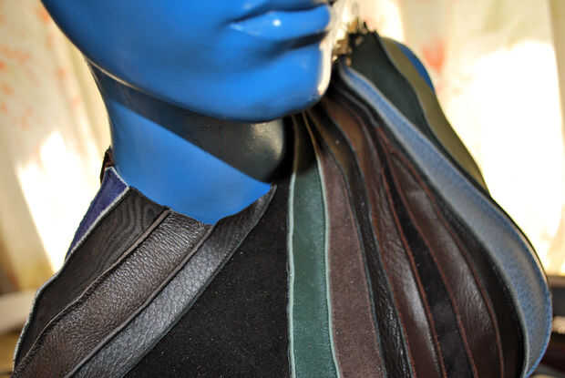 Nuevamente estoy haciendo un viejo caminante de aluminio en Kali, la diosa hindú de varios brazos, tres ojos de tiempo y de empoderamiento. Kali es la forma femenina de 'Kala', el término sánscrito para tiempo. Su "piel" está hecha de restos de cuero y piezas de viejas chaquetas, faldas y pantalones. En esta parte, he construido las muestras manos. Las manos son difíciles, así que planeé sobre el uso de la primera muestra de su cinturón. También hice algunas alteraciones a su busto y torso.