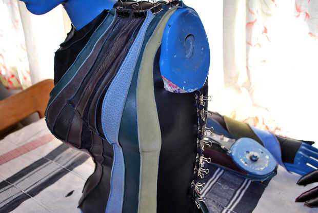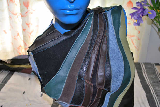 Para resolver este problema, me salió un pedazo de chatarra 1 1/2" de ancho elástico y había entregado al maniquí en su frente. Tiró el cuero hacia abajo hacia la parte inferior del formulario y me cubrió el elástico en el borde inferior de la piel. Luego dio la vuelta al maniquí y cubrió el lado opuesto en el borde inferior de la parte delantera. Hace el cuerpo suave y agradable.