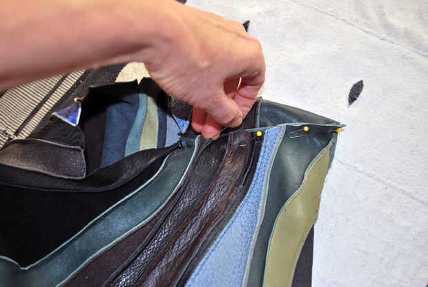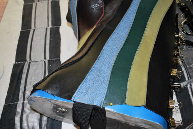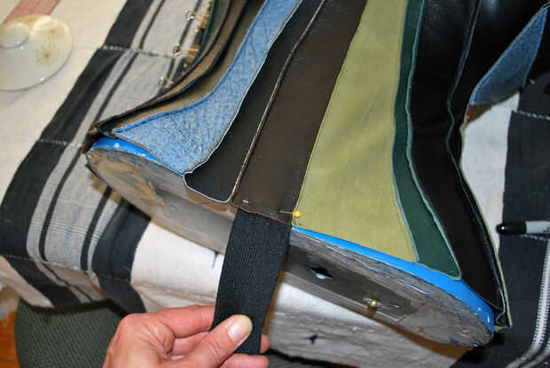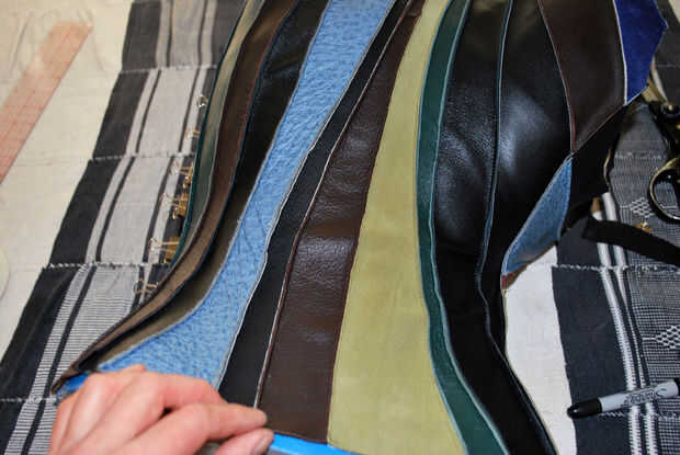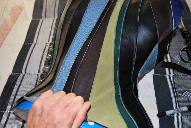 Después de fijar el elástico, decidí cambiar los clips binder con pernos de seguridad. Los clips fueron resbalando mientras me movía hacia adelante y hacia atrás el maniquí, y sabía que me loco después. Había evitado los pasadores antes de porque no quiero hacer agujeros en el cuero. Puesto que el ajuste era muy bueno ahora, pensé que podía arriesgar unos agujeros.