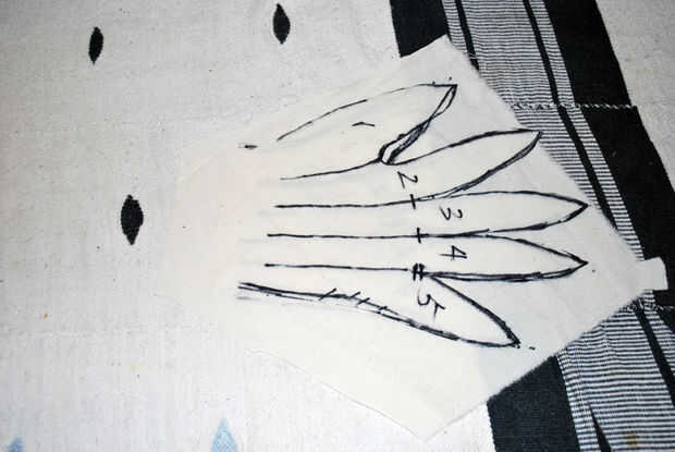 Extendió el guante sobre un trozo de tela de la muselina de chatarra y dibujó alrededor de él en Sharpie, añadiendo un poco más en cada dedo y a ambos lados de la mano. Me ha recordado las puntas de cada dedo para que se vean como garras. Después de dibujar los bordes exteriores, he quitado el guante y se basó en líneas en la muselina en una pieza separada para cada dedo. Limpié mis líneas, tachadas los que no quieren usar y cortar las piezas del patrón, haciendo marcas de muesca en la base de cada dedo.