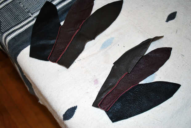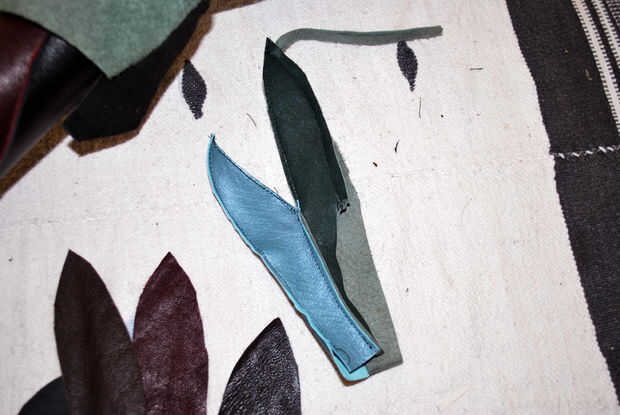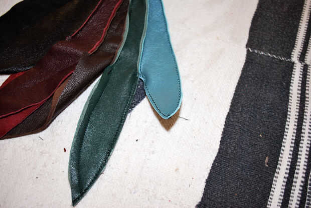 Cuando cosieron el cuarto dedo, no ir tan bien. El cuero verde oscuro que elegí fue débil y la piel rallada en la costura. Después de algunos insultos, he intentado quitar mi costura para desmontar las piezas. Esto provocó más lágrimas. Después todavía más groserías, decidido a cortar los dedos cuarto y pinky y comenzar de nuevo. Las otras piezas estaban bien, para cortar los dedos que sólo tendría la mano un poco más pequeño.