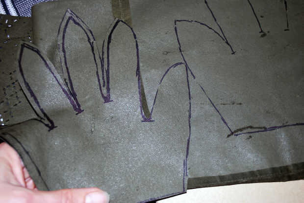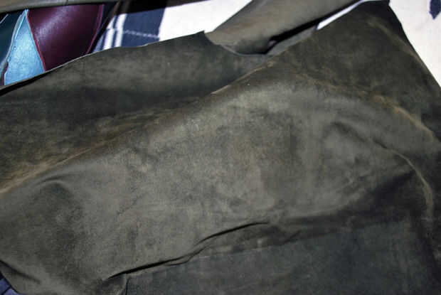 Puesto que algunos de mis pieles delgadas peso me habían traicionado, elegí un cuero mucho más fuerte para mi próximo intento a manos de Kali. El suede verde oliva de un par de pantalones de segunda mano tienda Capri fue tickets. Era delgado pero fuerte y artículo bastante parecido.