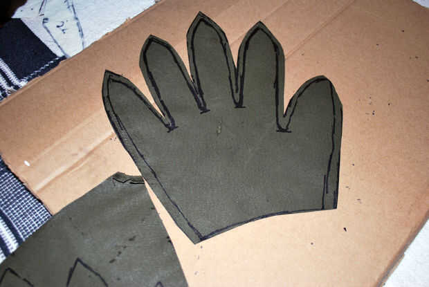 Después de tomar mi mano lejos, agregué 1/4 costura todo el camino alrededor de la mano. El cuero no era lo suficientemente amplio como para esto, pero no importaba. El plan era entregar esta pieza y utilizar como patrón para la mano exterior. Hice eso y rastrear todo el camino alrededor de él, añadiendo un extra pequeño donde había ejecuto fuera de sala de margen de costura en la primera pieza. Yo entonces cortado el dibujado en el margen de costura en la primera pieza. Ese sería el lado de la palma. También corté la pieza segunda, más grande para la parte exterior de la mano.