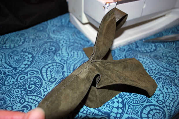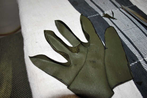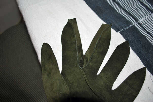Tomé una de mis tiras y había alineada con la punta del primer dedo. Cosí la tira para el dedo, manteniendo mi margen de costura a un escaso 1/4". Cuando llegué al punto donde el primer y segundo dedo conocieron, hice pequeñas tijeras para con mis tijeras alrededor de la curva para que el cuero mentiría plano. Luego cosí alrededor de la curva. El cuero del dedo bastante no se alinean con el borde de la tira, pero estaba bastante cerca. Guardé coser hasta llegar al punto del dedo segundo, cortar mis temas y presenta la pieza del guante en mi mesa de trabajo. Recortar los márgenes a un escaso 1/8" y me echó un vistazo en las puntas. Cortar poco profunda, puntas en ángulo en las tiras en los puntos del dedo. Ojala, haría las tiras un poco más en los bordes exteriores para que se alineen mejor con los dedos un poco más de la mano exterior.