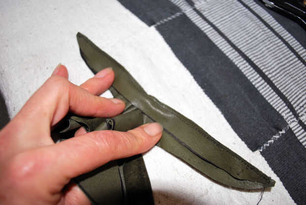 Luego cosí mi segunda tira entre los dedos segundo y terceros, disminuyendo las tiras en los puntos. Revocó el cuero sobre el que la tira sin querer pero no preocuparse. Planeé hacer muchas más manos. Si éste no era ideal, acostumbrarse para cinturón de Kali de manos. Me había ajustado el margen en la segunda tira abajo a una escasa 1/8" y utiliza mis uñas para presionar abrir las costuras. Me gustó la forma en que veía, así que presioné abierto la primera costura de la misma manera. Entonces cosía en la tercera tira entre los dedos tercero y pinky y pasó por los mismos pasos.