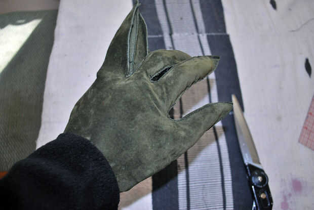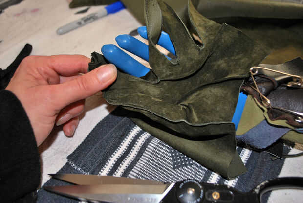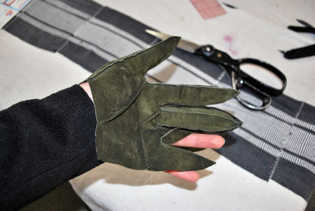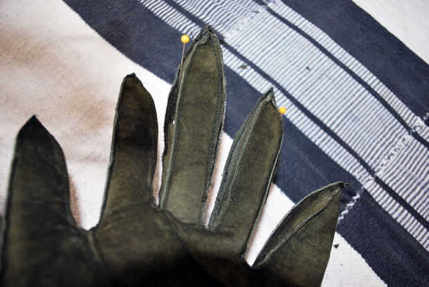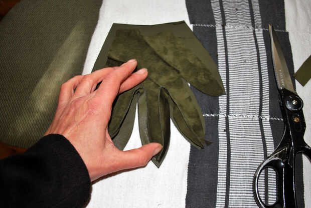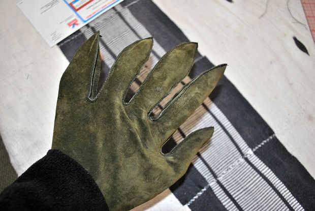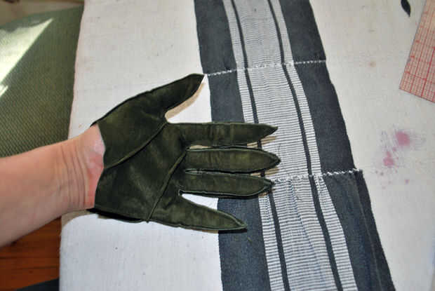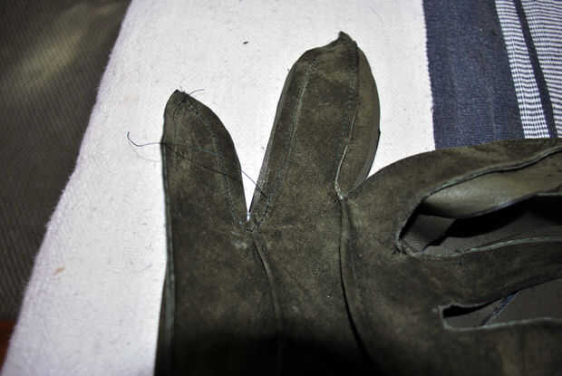 He intentado prueba Coloque el dedo pulgar y primer dedo sobre la mano de maniquí, pero no tuvo éxito. Las costuras hechas los dedos del guante un poco voluminosos, y era difícil de empujar el cuero entre los dedos de la maniquí. No se preocupe! Podía usar mi mano para comprobar el ajuste. Profundizó la curva un poquito entre los dedos cosiendo hacia abajo un poco más lejos de lo que tenía antes y recortado los márgenes de las costuras hacia abajo. Luego prueba ajuste los dedos de mi mano izquierda. Trabajaba bastante bien, así que seguí unir el resto de la mano y recortada por todas las costuras.