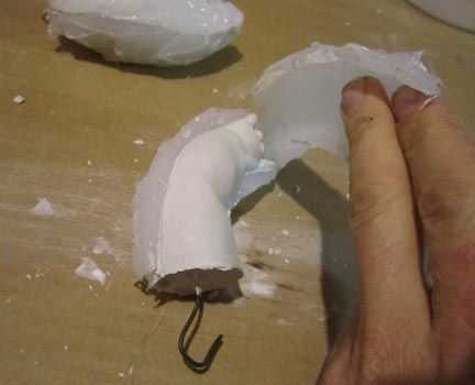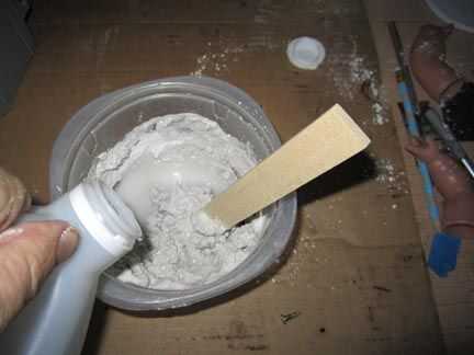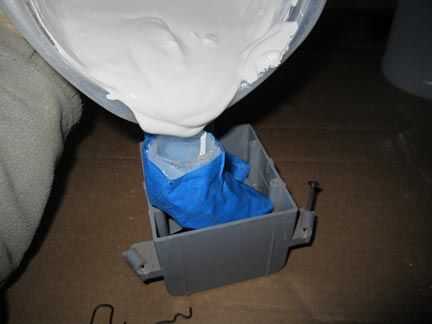 Poner los moldes en algo que les sostenga en posición vertical. Usé una vieja caja de empalmes eléctricos porque sucedió estar cerca. Mezclar algunas yeso hasta lograr una consistencia capaz de verter y llenar los moldes. Catarro es bueno. Ayuda a evitar las burbujas de aire atrapado. Agitan los moldes en el cuadro de un minuto libre de aire atrapado y luego pegar los ganchos cuando es lo suficientemente rígido para mantenerlos en su lugar pero antes de su demasiado duro para ponerlos a todos en el yeso. Si te equivocas y el yeso ya ha conseguido demasiado, no se preocupe, sólo dejarlo fijar, taladrar un agujero en él más adelante y pega un gancho en. (me pregunta por qué yo lo sé...)