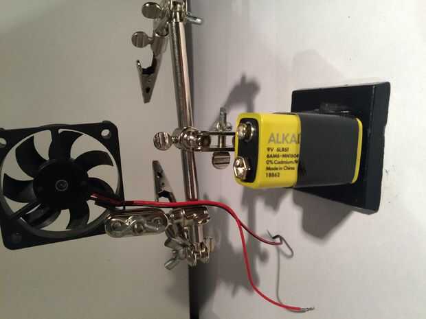 la soldadura del + los cables en el interruptor y - del conector de la batería a - en el cable que va al ventilador.
