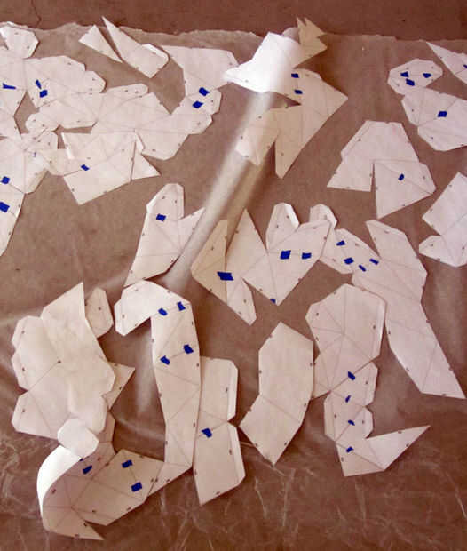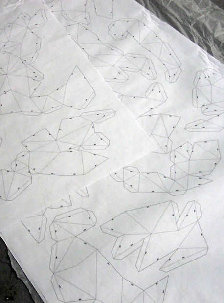 La primera imagen muestra los diagramas de como imprimir en hojas grandes de papel.  La segunda imagen muestra los diagramas después cuidadosamente estas cortando.  Una vez que estos se cortan hacia fuera (yo usé una combinación de tijeras y cuchillo mate), entonces estaba lista para empezar a utilizar estos como guías para cortar las piezas de plástico corrugado.