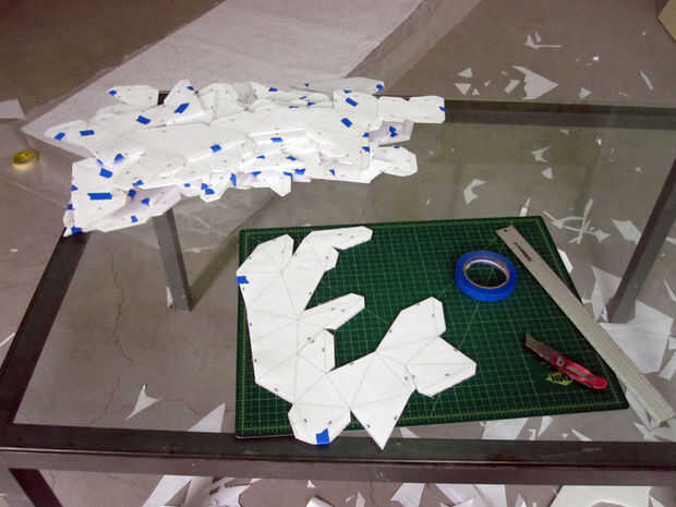 Una vez que tenga la forma general de cada pedazo cortado, luego siga la línea punteada del diagrama para anotar donde los polígonos necesitan doblar para crear la forma física del objeto. Serán en el lado donde se pone el diagrama o al revés según el patrón de línea punteada diferentes por los diagramas de Pepakura! Asegúrese de que entender que es lo que antes de empezar a cortar ya que son cruciales para el maquillaje total del objeto final. Yo uso cinta azul para mantener el esquema de juntas donde corté la cara del papel para hacer las cuentas.