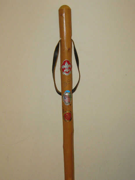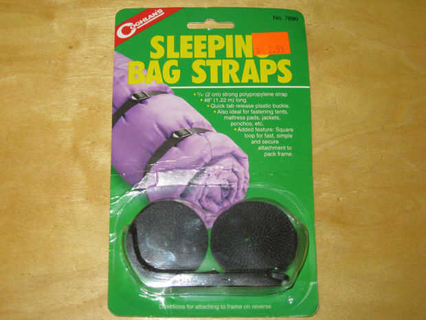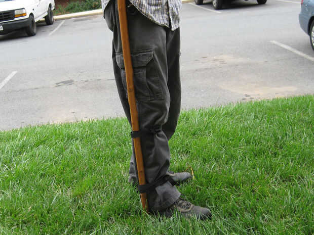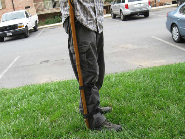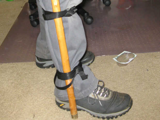 Todo lo que necesita es su bastón/poste favorito y un conjunto de correas de bolsa de dormir. Toma las correas y correa el bastón al lado de la pantorrilla. Coloque una correa debajo de la rodilla y la otra correa en el tobillo. Asegúrese de que las correas son buenas y ajustada para que el palo no flop alrededor. Pero no demasiado ajustado o puede cortar la circulación.