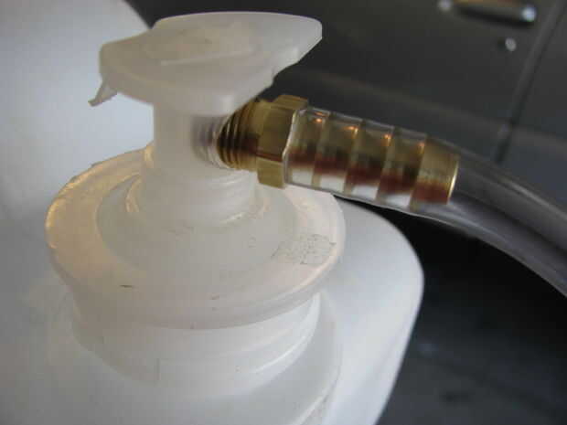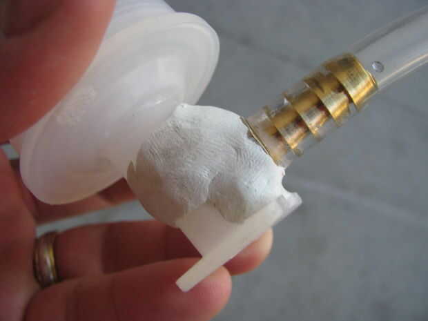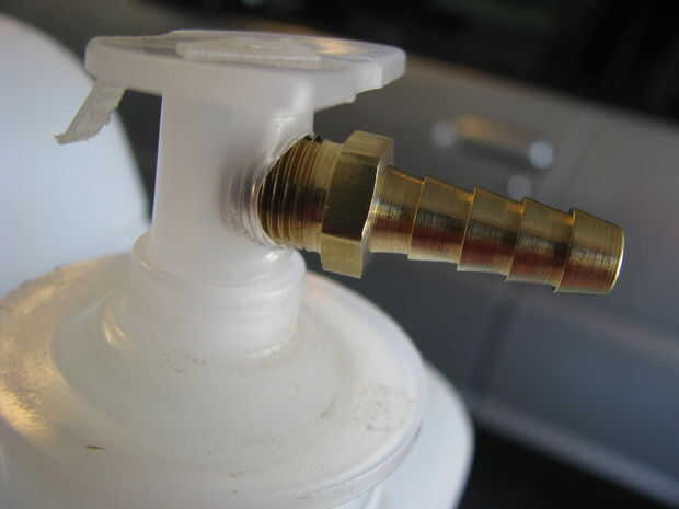 Enrosque el accesorio de latón en el pico de la jarra. Empuje la manguera de vinilo en el accesorio. Use masilla de epoxi para sellar el accesorio en el tubo de descarga. La masilla que utilizo se llama "agua de soldadura" y está diseñada para aplicaciones húmedas. Es seguro para el agua potable.