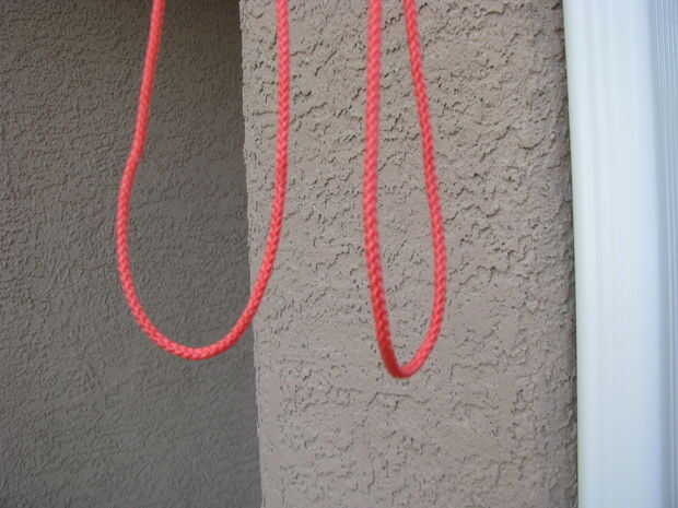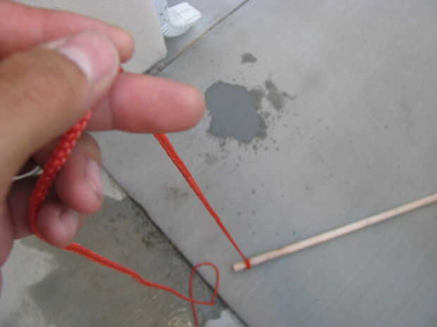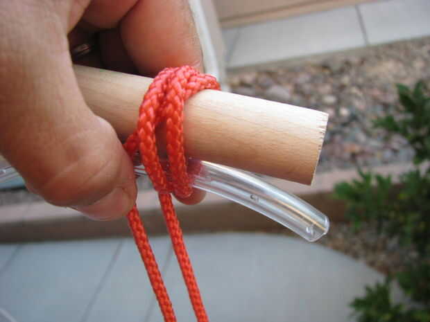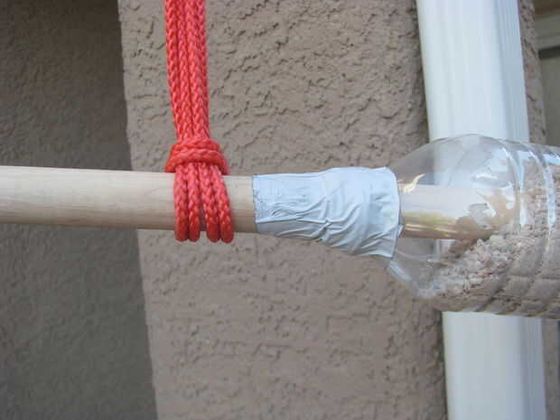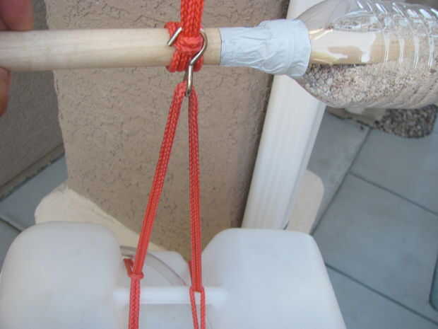 Puesto que usted puede colgar esto desde una altura diferente cada vez el campo, el "pedal" debe ser ajustable. Aquí es cómo hacerlo. Tomar el extremo suelto de la manguera con el extremo libre de la espiga ponderada de contador y baje más allá de la parte inferior de la jarra. Tomar el otro pasador, con el cordón atado a un extremo y poner en el suelo. Tire de la holgura en el cable y enróllelo alrededor de la manguera y el pasador superior. Cuando usted suelta el contrapeso debe tirar del pasador inferior o "pedal" fuera de la tierra.