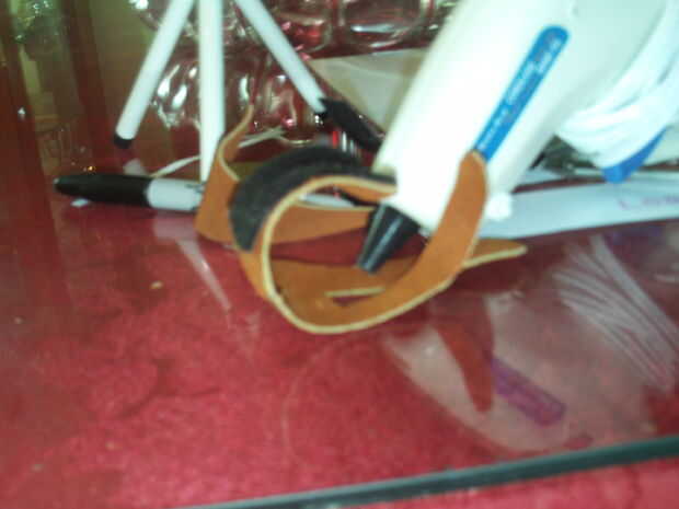Para este paso recomiendo caliente pegar el VELCRO® u otro herraje en cada una de las cuatro correas de cuero.  Puede utilizar los sujetadores traseros de pegamento, pero la experiencia me ha demostrado que los sujetadores espalda pegajosa Retire después de poco tiempo.   Si utiliza sujetadores espalda pegajosa, ¡ sustituir después de varias veces de quitar el soporte de la cámara. Dos cintas de un lado tienen los sujetadores de gancho en la parte superior y dos correas en el otro lado deben tener los sujetadores de lazo en la parte inferior que cuando se superponen las dos correas, sujetadores conectan.  La piel actúa como un puño que puede envolver firmemente alrededor de cualquier cosa de las barras de la silla de ruedas a manillar de bicicleta.