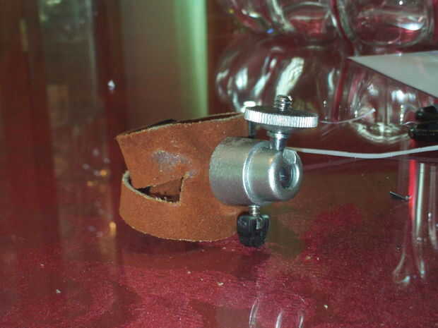 Tornillo del trípode en el centro de las correas de cuero "H" como en la imagen.  El tornillo es muy corto, por lo que el cuero sangrar algunos.  Asegúrese de apretar este tornillo lo más posible y en un ángulo tal que la cámara será vertical en el ángulo del deseo para que se montará.  Por ejemplo, este montaje sólo permite inclinar en una dirección.  Asegúrese de que se inclina en la dirección deseada sobre donde montar la cámara.