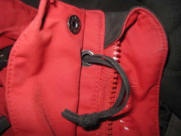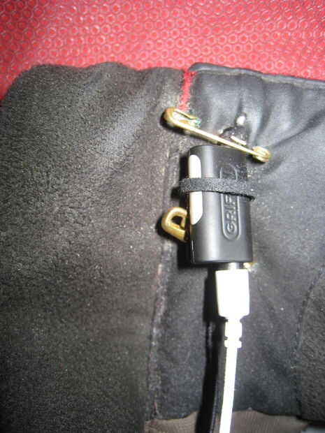 Para resolver el problema de ser capaces de contestar el teléfono con los guantes por hice un simple interruptor de la manija a la chaqueta: perforado un agujero en el cuello justo detrás del micrófono, reforzado con un ojete e insertar un bucle de cuerda fina a través de él. El cable va en el micro y cuando aprieta presiona el botón de respuesta en el lado del micrófono.
