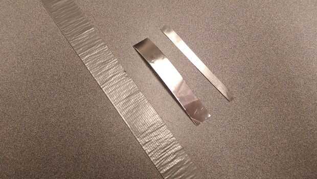Cortar dos tiras de cinta de aluminio. La más amplia de estos dos debe ser más delgada que la banda de cinta de conducto.