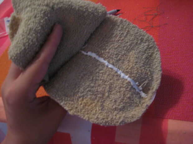 Luego, coloque una línea de pegamento por el centro de la manija y péguelo directamente encima de la línea de cosido.