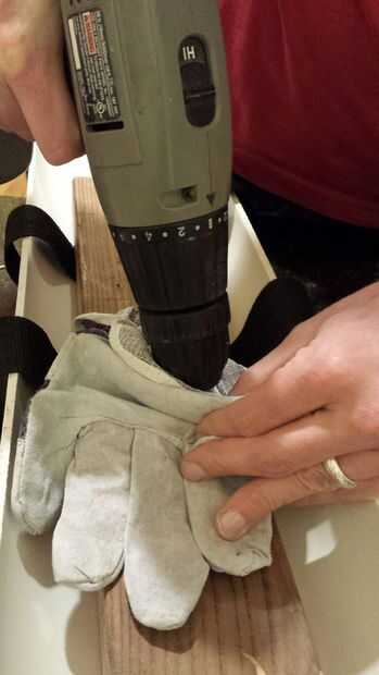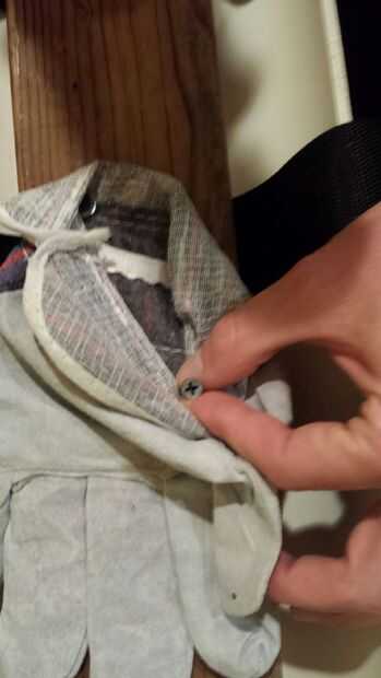 Luego atornilla el guante. Usé 5 tornillos y arandelas para evitar que el guante de lavado fácilmente. Esto es también lo que ayuda a todo el aparato para ser conectado a su brazo y mano, así que seguro es bueno. Luego, porque los tornillos en el dorso de mi mano eran incómodos, caliente pegué algunos relleno de espuma sobre los tornillos para mayor comodidad. Esto también le dio el guante un ajuste más apretado.