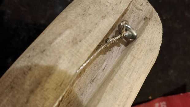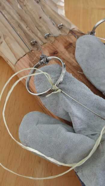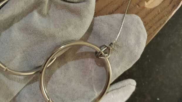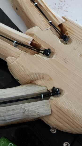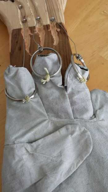 Ahora con todo juntos, los mecánicos están listos para poner en. Empecé con los cables. Corrí el hilo a través de los ganchos de ojo y después atado al gancho superior. La parte inferior del alambre se ata el llavero. La medida de esta debe de ser adecuado para que la mano es la cantidad correcta de enrollamiento del dedo con su propio dedo.