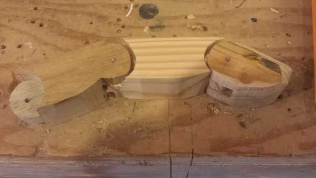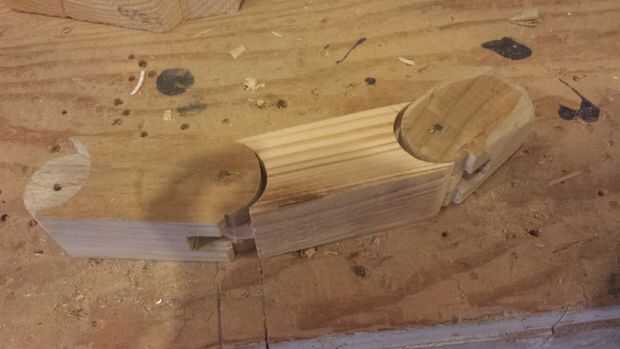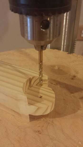 A continuación, con el taladro, utilice una 1" broca para hacer el extremo macho. Esto debe taladrarse abajo. 5" de ambos lados dejando un. 5" disco en el centro de ronda. Entonces, con la sierra, forma un extremo redondeado a cada lado del segmento (excepto la superior).