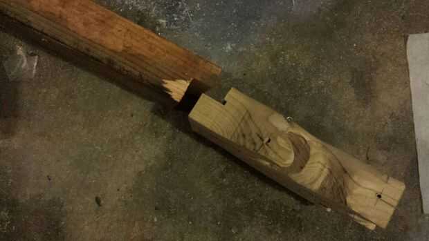 Para tener la mano colocar a mi brazo y poder manipular los dedos necesitaba tener una extensión del brazo. Para ello, corté la palma para bloquear con un 2 x 4. la fueron pegadas juntas usando un buen pegamento de carpintero sobre cualquier superficie y luego, afianzado con abrazadera juntos hasta que se seque. Pueden agregar tornillos para soporte adicional.