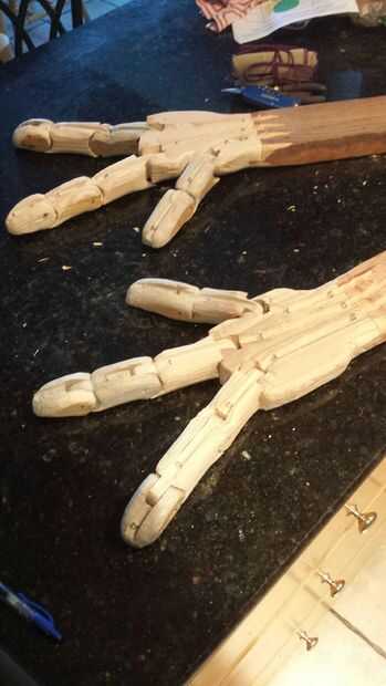 En orden para los cables de tracción no palillo hacia fuera y donde yo quería, corte las pistas en la palma. Utilicé la herramienta dremmel para esto. Les van desde los dedos hasta la muñeca donde sería mi mano manipular los cables tuve. Ganchos, necesitará colocarse en estas pistas a través de la palma para guiar los cables hasta la muñeca y el brazo.
