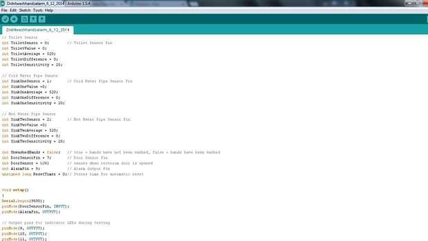 Si (abs(ToiletDifference) > ToiletSensitivity & & millis() > 20000) //waits 20 segundos para establecer promedios {digitalWrite (10, HIGH); //turns indicador LED Serial.println("Toilet"); //This Sensor superado la sensibilidad umbral Serial.println(ToiletDifference) //Difference entre el valor actual del sensor y sensor media if((millis()-ResetTimer) > 30000) //waits 30 segundos para el tanque a llenar antes el baño el sensor puede activarse otra vez {UnwashedHands = true; //sets mano lavar estado ResetTimer = millis(); //Stores hora de reset automático}} else {digitalWrite (10 BAJA); }
