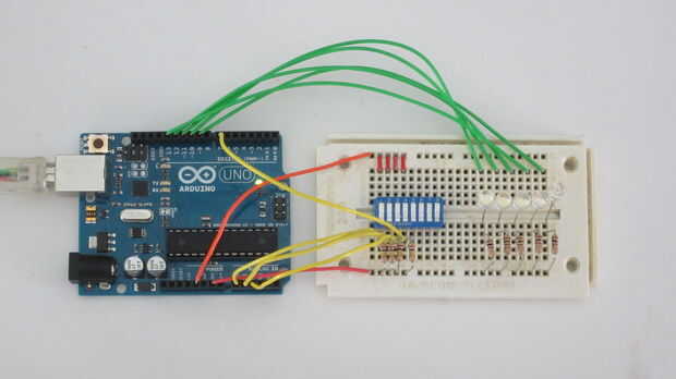 En primer lugar, yo el prototipo el amplificador de circuitos en un protoboard para probar. Empecé probando el código utilizando una matriz de conmutadores en lugar de los sensores piezoeléctricos. Una vez que estaba trabajando, os adjunto los sensores piezo y el amplificador sobre un segundo tablero.